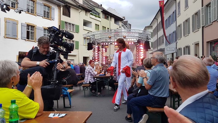 Ja das Wetter war durchzogen und immer wieder zogen dunkle Regenwolken vorbei, doch der Regen blieb in den Wolken. Schon kurz nach fünfzehn Uhr begannen in Klingnau die Proben zur Live-Sendung „Donnschtig-Jass“. Kameraeinstellungen wurden noch verfeinert und die Akteure probten ihre letzten Schritte aber auch den Auftritt für den heutigen Abend.
