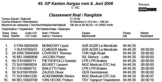 Bedrohlich hingen die Regenwolken über Gippingen als die Spitzengruppe die letzten Kilometer vor dem Zieleinlauf einläuteten. Ein Geplänkel auf der Zielgeraden und schon glaubte man, dass Martin Elmiger seinen zweiten Sieg nach 2003 einfahren würde, doch auf dem Zielstrich fing ihn sein Markenkollege Lioyd Mondory ab.