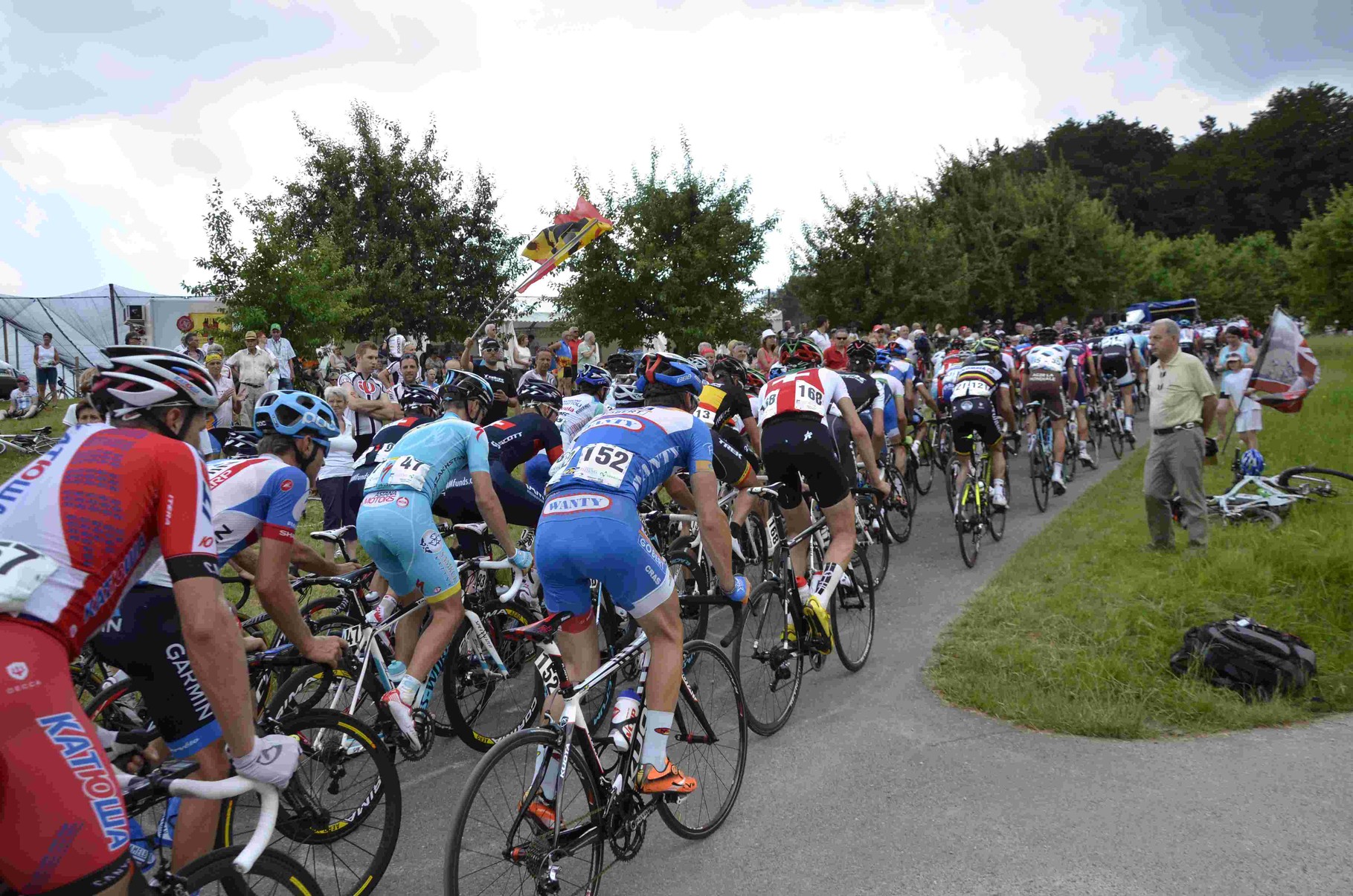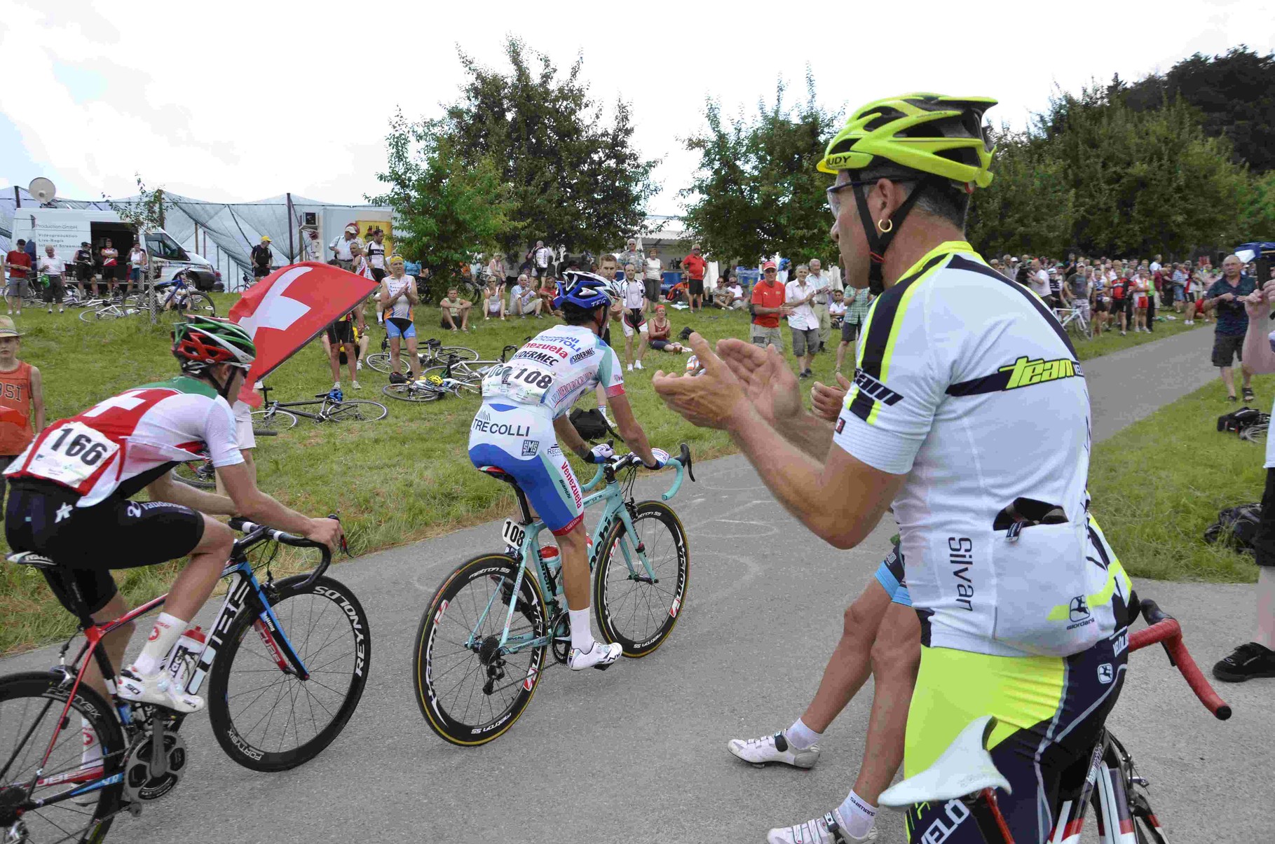 Kurz nach 13.30 Uhr gingen die Fahrer auf ihre 15 Runden und schon ganz am Anfang der 181.5 Kilometer fuhren drei Ausreisser weg. Mit der Nummer 166 der Schweizer Mirco Saggiorato, der Deutsche Roger Kluge mit der Nummer 94 und der der Italiener Gianfranco Zilioli. Mit der Nummer 108.