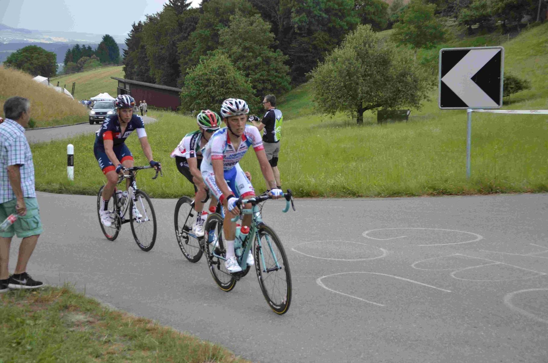 Diese drei Ausreisser hatten schon bald einen beachtlichen Vorsprung von über neun Sekunden und genossen lange die Freiheit der Führenden. Hinten im Feld wurde gebummelt und man hatte es nicht so eilig, denn die Mittagshitze hatte sich etwas gelegt und einige dunkle Wolken stiegen auf und verdeckten die Sonne. Sechs Runden vor Schluss war die Ruhe im grossen Feld vorbei und man blies zum Schlussangriff, der Vorsprung schmolz und schon bald konnte man mit dem Zusammenschluss rechnen.